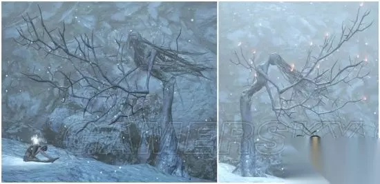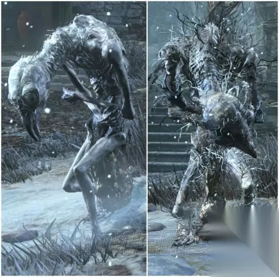 (左为无火,右边树梢有火) 出没地:雪原、鸦村、绘画底端 刚进DLC时充当场景装饰的怪物,到雪原后开始出现活体版本,会吐出持续伤害和累积冻伤值的冷气吐息,也会伸长树枝状的手巴你,距离蛮远的,在脚下打他时会使用抓技,把玩家抱起来后零距离喷冷气,树梢有火的版本会使用追踪火弹,虽然速度很慢,但是追踪性很强,飞行距离也很远,非常烦人,虽然自己用火,但被火属性攻击打到会产生大硬直,道具说明完全没提及,设定不明的存在。 白树女(爬行)