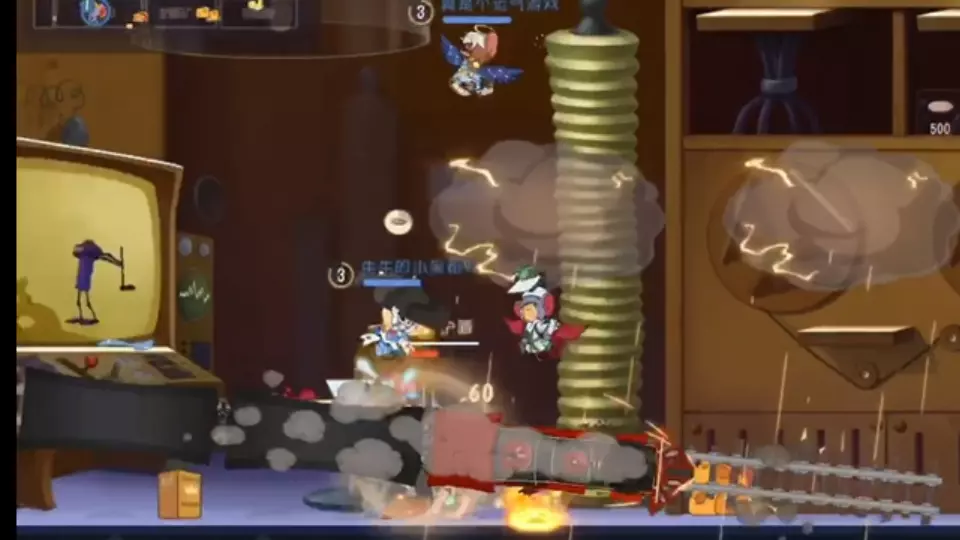 这是《猫和老鼠》手游的对战画面,展示了猫鼠双方在房间场景里激烈对抗的过程,猫方试图放飞老鼠,鼠方则展开周旋,过程中还有技能释放、道具使用等精彩对战内容。