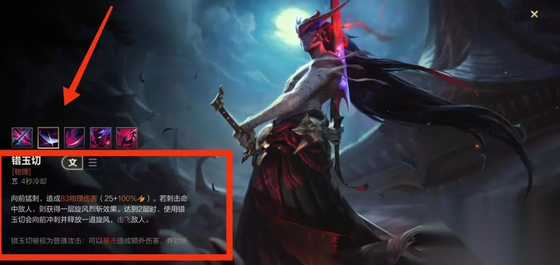 英雄联盟手游永恩除了被动技能外的四个技能是: 1.一技能 错玉切:向前猛刺,造成83物理伤害,若刺击命中敌人,则获得一层旋风烈斩效果。达到2层时,使用错玉切会向前冲刺并释放一道旋风,击飞敌人。如下图所示: