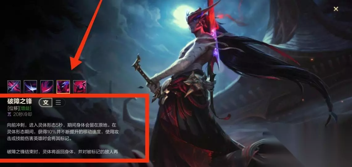 3.三技能 破障之锋:向前冲刺,进入灵体形态5秒,期间身体会留在原地。在灵体形态期间,获得10%并不断提升的移动速度,使用攻击或技能伤害英雄时会将其标记。如下图所示: