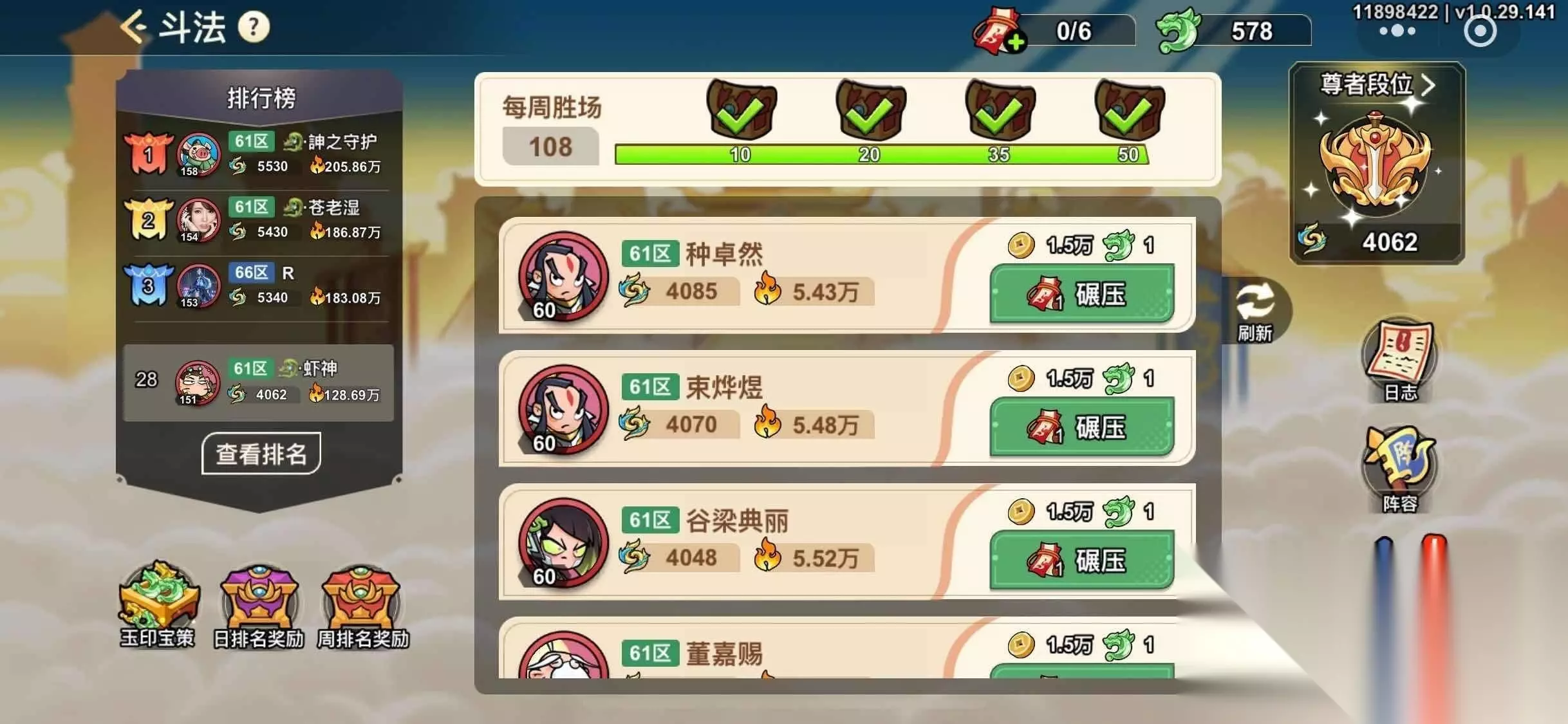 五、斗法周活动 1、玉印全部存好,等待斗法周开启,再使用,通过使用玉印可以获得积分,相应的积分可以获取资源。 2、斗法周会需要很多的金币作为支撑基础,所以平时金币包可以不开启; 六、斗法技巧 1、不要追求对方的积分高低,首先要保证稳赢。 2、尽量去打低战力高积分玩家。 3、在保护期内,不要去打对方,安全第一。 4、斗法的奖励非常丰富,特别是周奖励,所以每周日需要存券,争取获得好的名次。