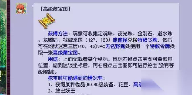 梦幻西游高级藏宝图怎么获得 获得方法介绍: 梦幻西游玩家可收集定魂珠、夜光珠、金刚石、避水珠、龙鳞后,找傲来国(127,120)偷偷怪兑换特赦令牌,然后可在地狱迷宫三层(40,45)NPC无名野鬼处使用一个特赦令牌换取一张高级藏宝图。
