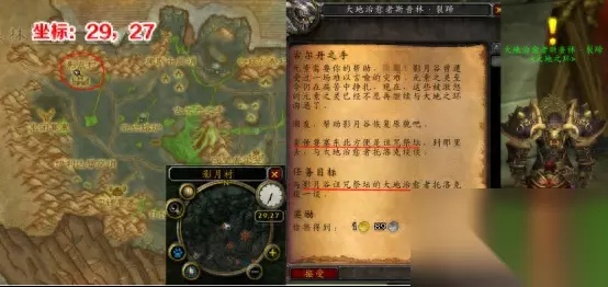 部落方在影月谷的影月村找大地治愈者斯普林·裂蹄接任务,他位于影月村左上角塔楼下方,坐标29,27。