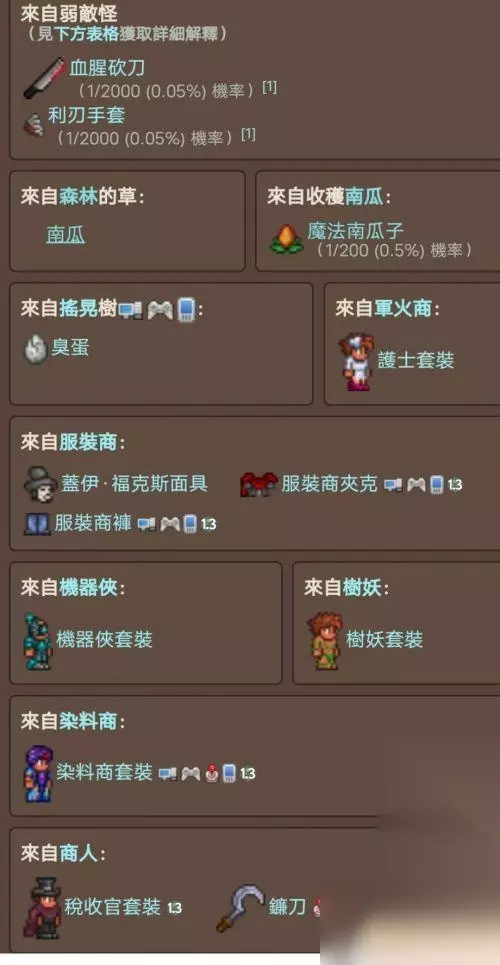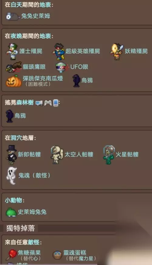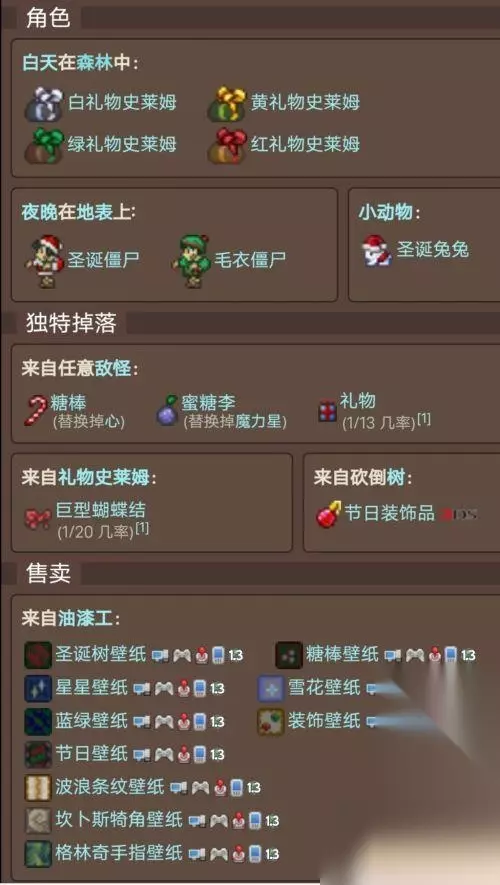 节日期间所有怪物都有1/13的几率掉落礼物,雕像召唤的怪物除外,另外手杖糖果会代替爱心,梅子糖会代替出现魔力星星出现。