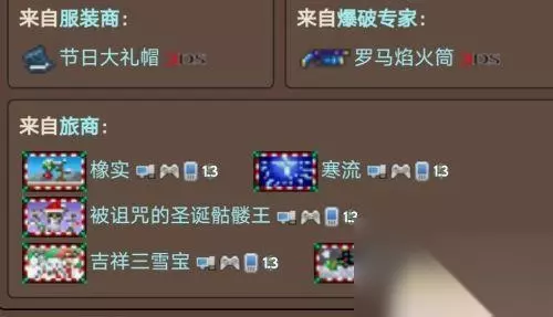7.圣诞节( 12.1-12.31)(pc版12.15-12.31) 圣诞节是泰拉瑞亚的季节事件,发生在12月1日至31日(电脑版是15-31日)。