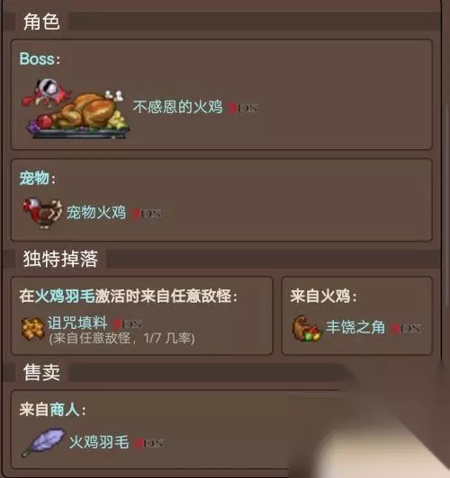 也可以通过南瓜月事件触发万圣节 6.感恩节 (11.1-11.30) 感恩节是泰拉瑞亚移动版和3DS版独占的季节性事件,事件从11月1日持续到11月30日。 感恩节期间,可以牺牲诅咒填料和火鸡羽毛来召唤困难模式之前的 Boss 不感恩的火鸡。