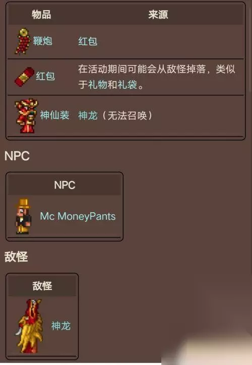 可以通过霜月来触发圣诞节。 在困难模式中,礼物可能会包含的物品之一是水晶雪球,这可以召唤雪人军团。打败雪人军团会让圣诞老人 NPC 可以在有有效的房屋可用时生成,但仅限于圣诞节期间。 8.中国春节(农历正月初月之前的晚上,即 1 月 21 日至 2 月 21 日之间。直到元宵节(第 15 天)结束。) 中国新年是一个未实现、移动版 移动版专有的季节性事件。由于未知原因,它永远不会发生,仅以正常游戏过程中无法遇到的资料形式存在。后来,当版本更新到1.3时,它与所有其他移动版独有的季节性事件一起被删除。
