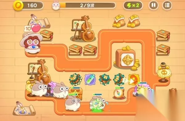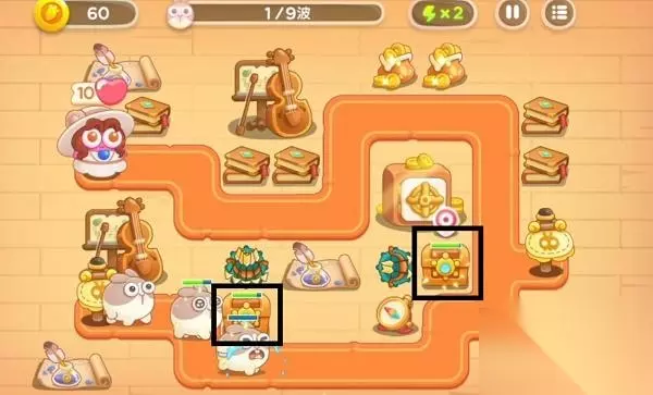 1、先在靠近出口的中间布置1个3级的多重箭(打兔子的同时还能清理建筑物),第一波兔子是很慢的兔子,稳稳的。有金币了就继续在中间偏右位置建造多重箭,出口的打兔子,右侧的打宝箱。中间布置箭塔的好处时,既能清理周边的建筑物,又能上下打兔子。先想办法打了2个炮塔箱子,箱子里是火瓶子。