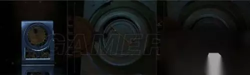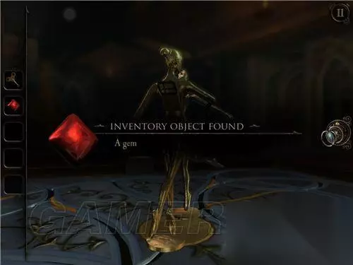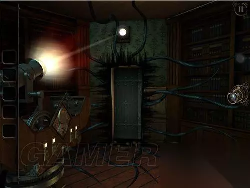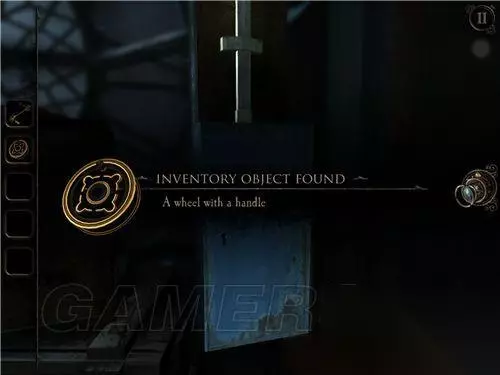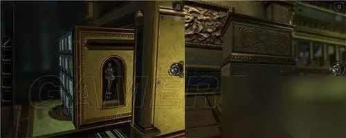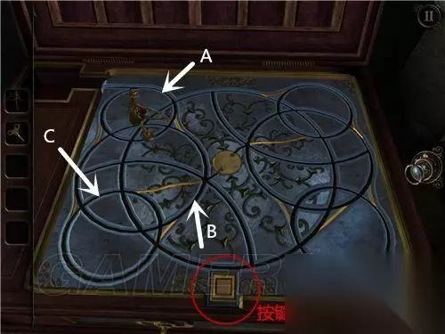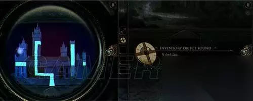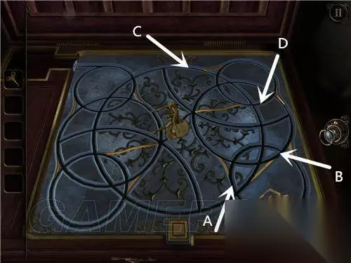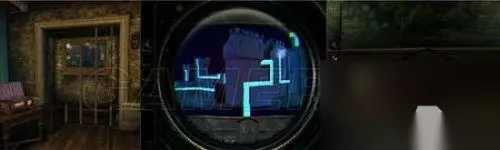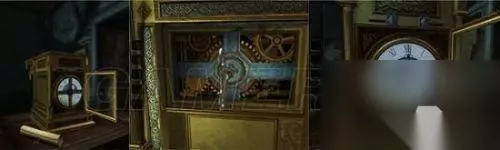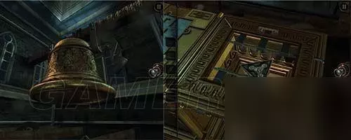 看到这里(如图所示),将转轮安上,上方的钟敲响,铁门旁的红水晶被震碎,铁门打开。 用透视镜看画,将光点走出白色线条,拿到钟面。