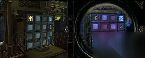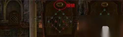 8 退回至房间,看向这个地方,最下方缺了一颗宝石,将红宝石装上。参照下面两个图形摆出。(记得摆好后点击上方按键。)