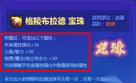 dnf龙珠是啥 1、龙珠是指格陵布拉德宝珠,它以百态的属性赢得了【龙珠】的称号; 2、附魔后所有属性强化增加16点,力量或者智力增加50点,物理、魔法或者独立攻击力增加50点,同时赋予武器自身属性强化中数值最高的属性; 3、而且该宝珠只能够交易一次,交易后就变成账号绑定了。