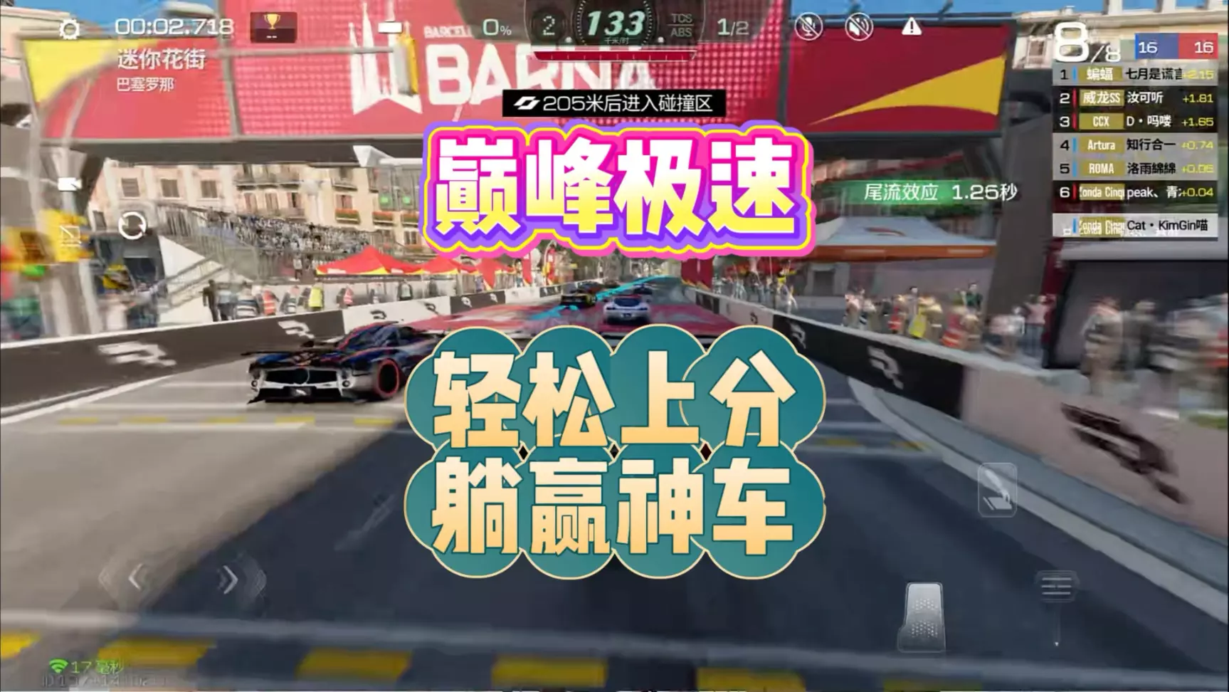 这是《巅峰极速》的游戏内容,展示了461分的二阶思域FK8在巴塞罗那赛道的粗跑过程,最终跑出2:44.507的非极限成绩,该车抓地表现出色,但漂移表现疲软。
