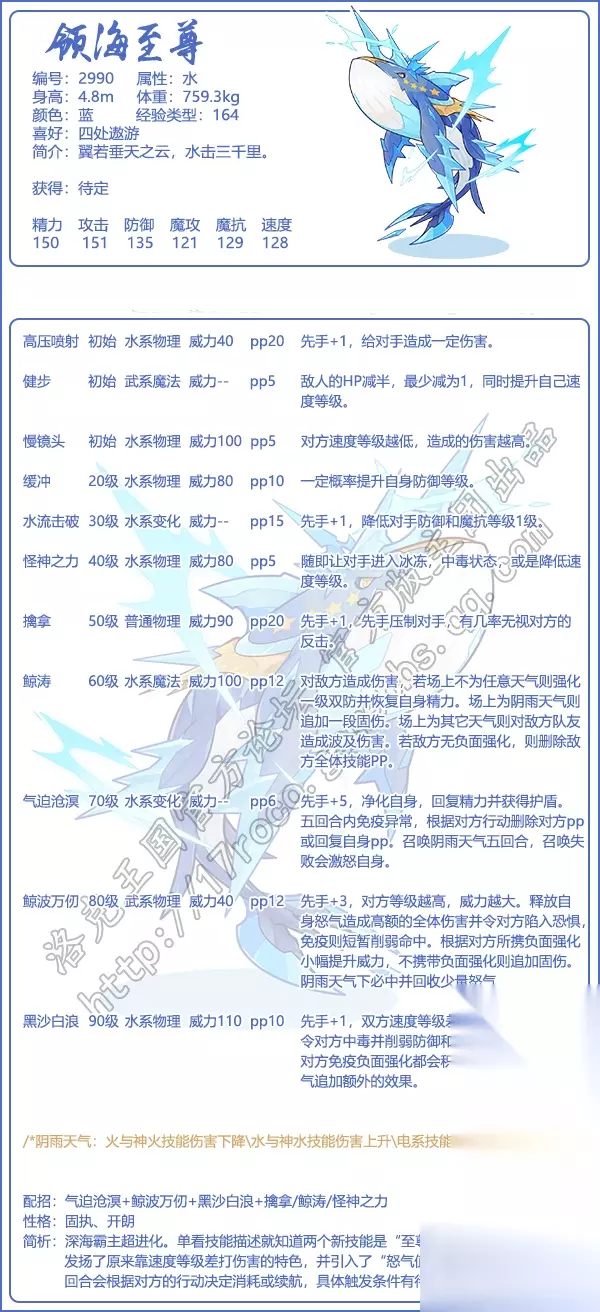 • 属性: 水 • 身高: 4.8m • 体重: 759.3kg • 颜色: 蓝 • 经验类型: 164 • 喜好: 四处遨游 • 简介: 翼若垂天之云,水击三千里,展现了其不凡的实力与风采。 2. 技能与战术配置 技能表如下: • 气迫沧溟: 高速攻击,可能触发怒气值。 • 鲸波万仞: 传说力量加强版,依赖怒气值造成大量伤害。 • 黑沙白浪: 可能提升自身防御,怒气值状态下效果更佳。 • 擒拿/鲸涛/怪神之力: 进攻或辅助技能,具体选择视性格而定。 性格推荐: • 固执: 提升攻击力,适合追求高爆发的玩家。 • 开朗: 增强防御力,适合注重防守的策略。 技能配招建议: • 结合固执性格,可以选择气迫沧溟+鲸波万仞,利用怒气值强化输出。 • 开朗性格则可搭配黑沙白浪,提高生存能力。 3. 性格与怒气值机制 领海至尊的性格影响着其技能的触发与效果。怒气值机制让战斗更具策略性,但具体触发条件还需进一步研究和实践。 常见用户问题解答: 1. 领海至尊如何获得? - 领海至尊是VIP专属宠物深海霸主的超进化,可通过VIP服务获取。 2. 领海至尊的种族值如何? - 除了魔攻值稍弱,其他种族值表现优秀,尤其在视觉上极具吸引力。 3. 领海至尊的最佳性格选择是什么? - 固执性格适合追求高攻击力,开朗性格则偏向于防御强化。具体选择需根据玩家的战斗风格。