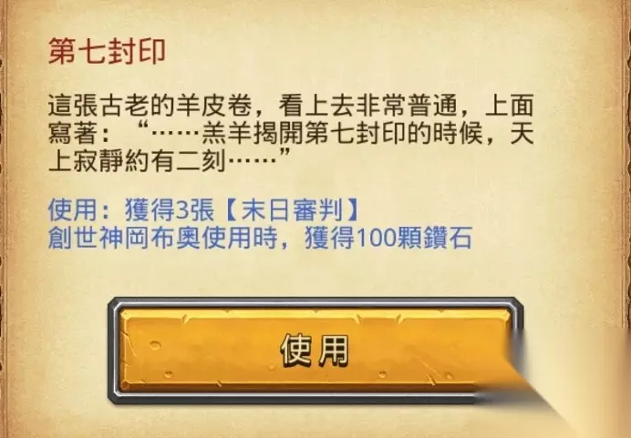 新手或中手可利用简单级刷满钻石上限,老手在升星过程会自然刷满。 创世神的100钻石卷轴是从每层随机出现的布罗克尸体中取得 翻出卷轴后,名字叫第七封印,也有分为三个角色使用种类,分别为收魂者使用卷轴效果加倍,十字军20000金币,创世神拿100钻 拿到哪个角色用的卷一切都是看脸,只能用次数去慢慢刷出需要的。