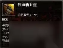 有了着精修后打BOSS什么的都不怕没怒气了,可以尽情输出.着技能只加到8重天应为只需要把精修的裂骨和疾风加满就OK了. 第二招:烈血五重斩