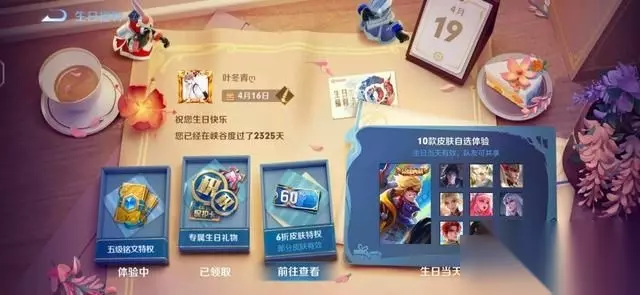 除了皮肤打折这一福利之外,你还可以为自己选择十款皮肤,这十款皮肤的组成分别是一款荣耀典藏皮肤,三款传说皮肤以及六款史诗皮肤。 注意这些皮肤的使用期限仅限于你生日当天,不过他有一个好处,我们上面也提到了,这些皮肤是可以共享的。 你要知道目前在游戏里面共享皮肤可是V10玩家的特权。 所以在生日当天,即使你不充钱,也可以享受到V10玩家的特权,让你在好友面前装一把。