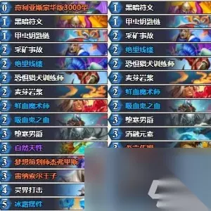 二、卡组介绍 1、血DK卡组是一种强力的卡组,以高生命值和强大的进攻能力著称。 2、在新版本中,梦想策划师杰弗里斯与血DK的配合非常默契,能够提供强大的斩杀、解牌和大怪,使其在各种对局中都有出色的表现。 3、关键构筑卡片:甲虫钥匙链、卑劣的脏鼠、灵界打击等,此外,血DK卡组还依赖于尸体的数量来进行防守,因此在游戏中对尸体的控制非常重要。 4、血DK卡组的中速控制定位使其在防守和进攻之间能够灵活转换,特别是在前期通过强势的单卡如采矿事故、奶酪龙等占据优势,中期可以依靠强大的控场牌和进攻牌来决定胜负。