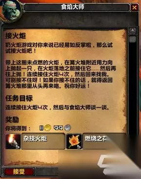 魔兽世界tbc火焰节任务攻略 1、扔火炬 在奥格瑞玛智慧谷可以接到任务,限定时间为40秒,需要把靠近篝火堆把火炬扔中火盆,扔中后角色右上角有buff显示,累计到8层即可完成任务。