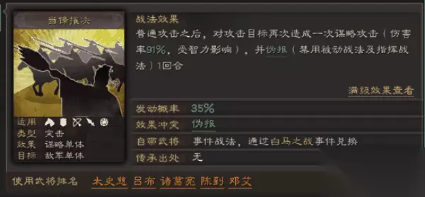 一、当锋摧决 最适合拆卸的指挥类战法是盛气凌敌,原因就是当锋摧决的兴起,如果没有盛气凌敌的克制,太史慈带上当锋摧决后可以说几乎就是秒杀对面。什么横行无忌的蜀枪,遇到带当锋的爆头骑、太史弓,什么诸葛亮赵云张飞的都得跪下。不过这个战法是事件战法需要武将兑换,比较贵,玩家如果想走输出流派就选当锋,如果想稳妥一点就选盛气凌敌。