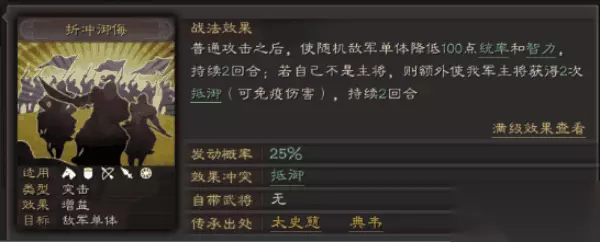 二、折冲御侮 折冲御侮是太史慈和典韦的传承技能,太史慈不要拿去拆了,要拆拆典韦的,因为给了太史慈折冲御侮那么一场就可以触发5次以上的效果能保护、降维、增伤,所以可以说是神技,强度与当锋摧决不相上下。