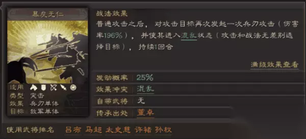 三、暴戾无仁 董卓的传承战法,传承的时候考虑一下,虽然战法效果超群,但毕竟董卓不好获得。暴戾无仁的效果比一骑当先、百骑劫营、鬼神霆威效果要好一大截的原因就是后者需要武将是主将才能造成更多的伤害,如果不是伤害就只是A级战法的水平,其中吕布特别容易挂所以给他安排一个暴戾无仁去当副将效果会更好,此外马超赵云甚至张飞都可以带上。