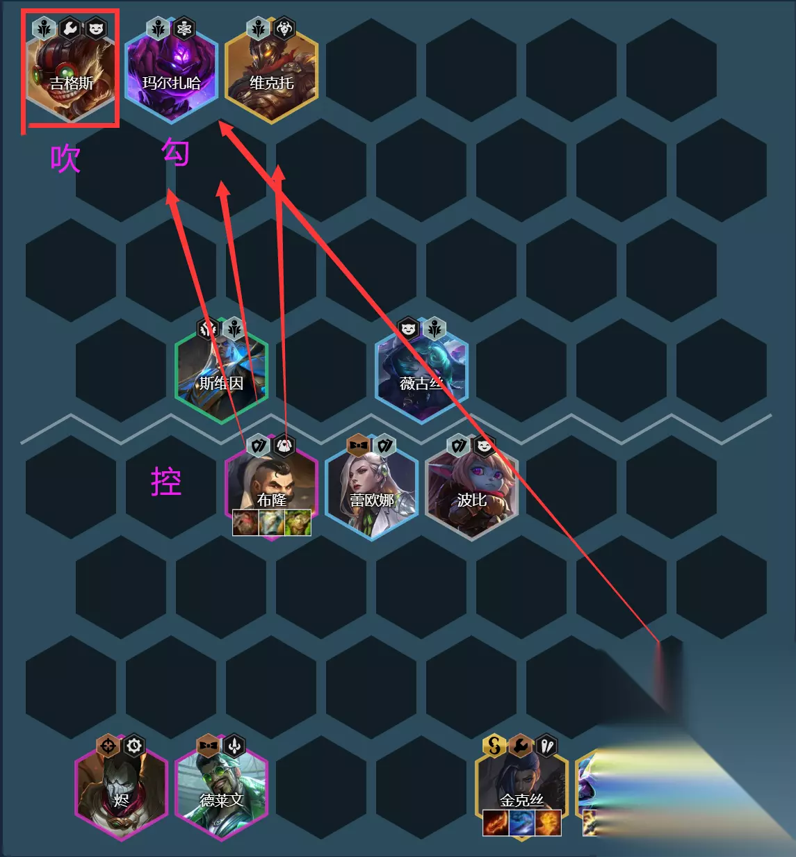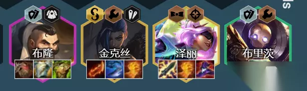 主C泽丽:电刀+帽子/法爆+正义之拳 副C金克斯:羊刀+巨人捕手+正义之拳/饮血剑 坦克布隆:石像鬼板甲/泰坦+龙牙+救赎/狂徒 装备解析:泽丽的核心装备是电刀,泽丽的装备是优先拿电刀打工,前期电刀是主要的输出核心。这个装备可以给卢锡安打工过渡,前期YYDS。后期能够给阵容减少魔抗,而其他装备建议出AP装,帽子、法爆均可,最后一件装备补充回复,正义之拳最佳,其他次之。 其次副C金克斯的装备还是传统的3件套,羊刀+巨人捕手+回复,羊刀和巨人捕手必备,这两个是后期输出的核心。 坦克布隆则是主要消化所有的防御装,石像鬼板甲、泰坦、反甲、龙牙、救赎这些有什么做什么即可。