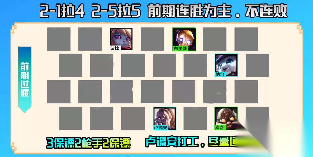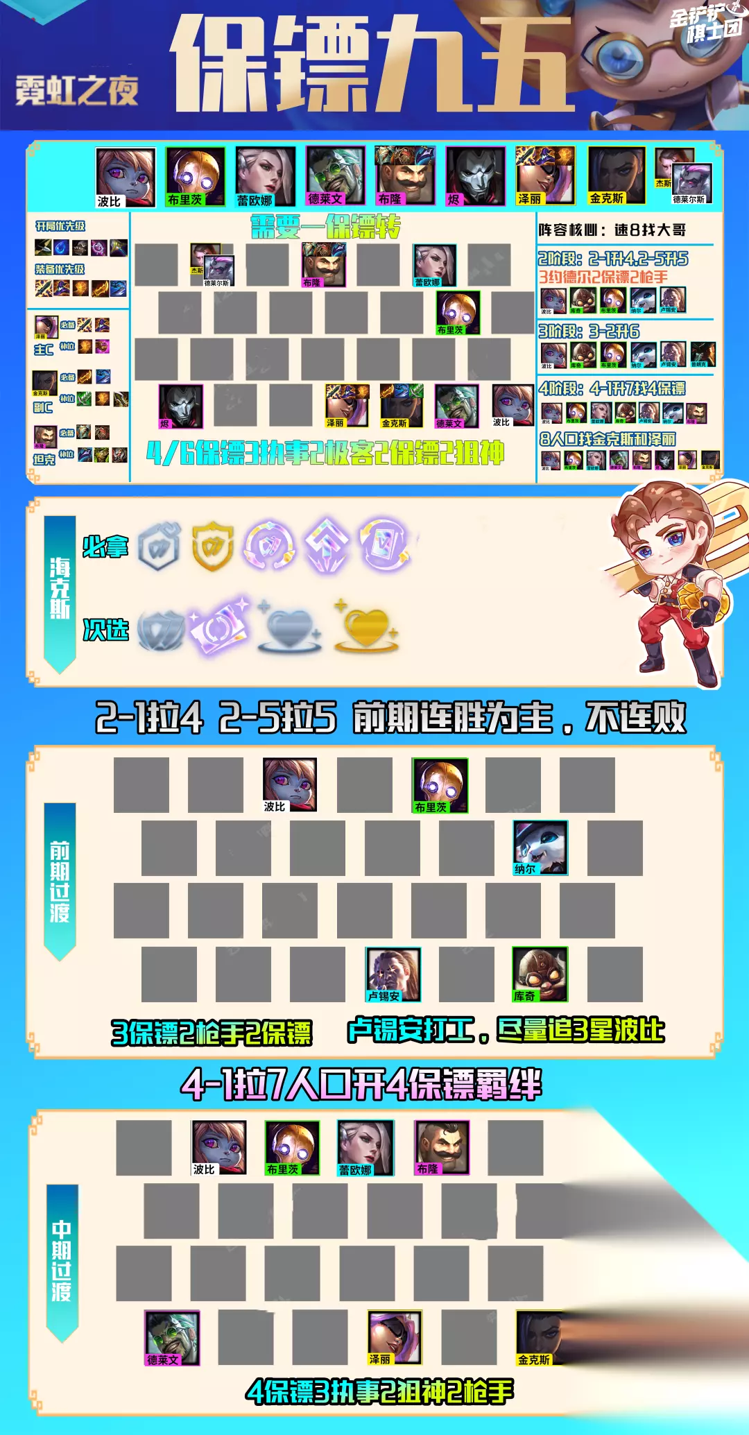 运营思路:保镖九五一直都是一套运营为核心的过渡阵容,核心卡牌是5费卡的金克斯和泽丽,这些只有到9人口才比较容易到2星,因此前期的运营过渡就非常重要,一定要连胜拉人口! 装备选择:开局装备优先拿反曲弓、女神泪,优先做出电刀这个装备给卢锡安打工。 前期阵容:2-1拉4人口,2-5拉5人口,前期优先拿3约德尔保镖枪手打工过渡,卢锡安拿泽丽的装备。这套阵容体系是最佳的过渡阵容,而且能够跟别的阵容任意转换,后期可以根据主C改变阵容方向。其次有3约德尔前期的经济,也能够迅速拉高人口。