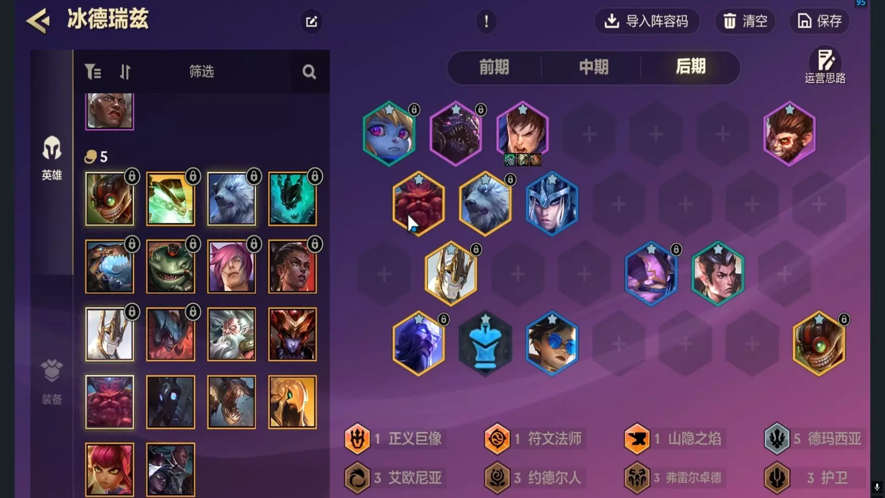 中期阵容:3-6/4-1两个阶段拉7人口,如果前期是连胜经济不错的情况下,优先提速拉7人口。这里拉7人口为了能够开4保镖,找到2星的卢锡安即可迅速拉9人口。 正常情况下,3阶段有2星卢锡安可以直接考虑速拉8人口,4-1到4-3阶段可能直接会掉两拨血量,但是影响不是特别大,优先考虑拉8人口增加5费卡的概率。只要找到1张5费卡就是天胡的局。 中期可能会被带有鬼书的马尔扎哈和黑魔枪卢锡安乱杀,装备同等情况下,保镖打黑魔天然是劣势,护甲对于黑魔完全没用,中期可以直接掉1-2波血量直接拉高人口即可。