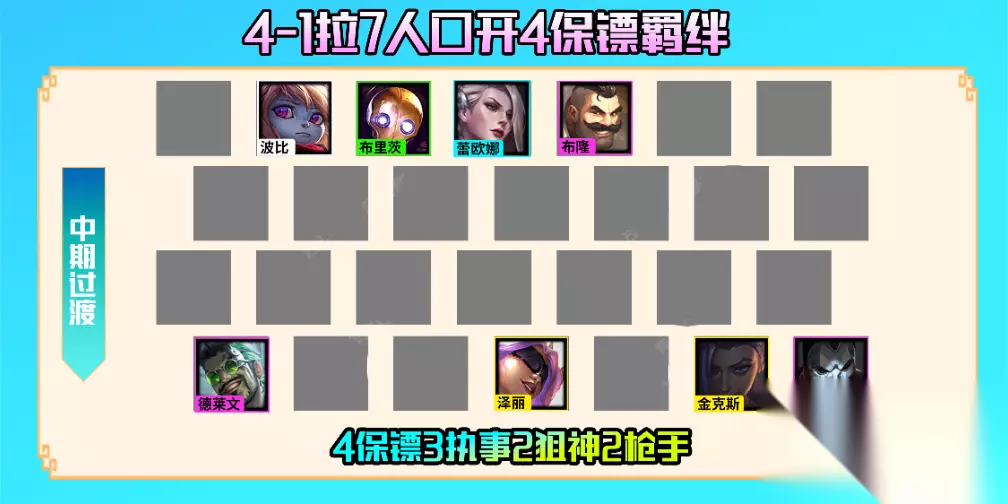 后期阵容:4阶段必须拉8人口,时间点根据前期运营思路和经济情况准备,如果直接吃了3-4连败,并且每次都是被血入的情况下,则需要提前拉人口,只要有20-30金币去抽卡的即可。如果抽到了2星德莱文可以用4保镖3执事德莱文去过渡,如果是抽到了泽丽或者金克斯,那么可以锁血考虑拉9人口。