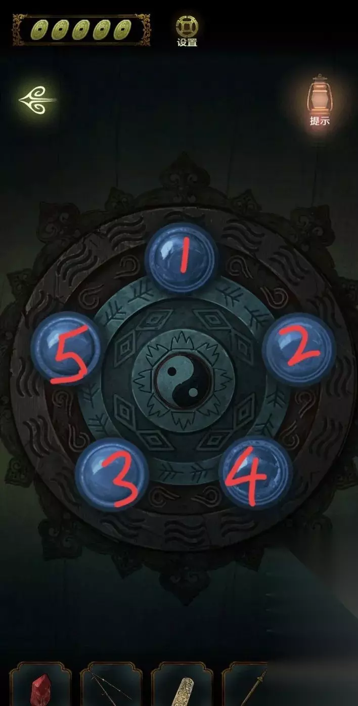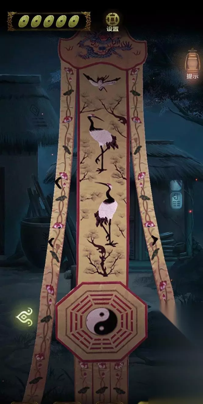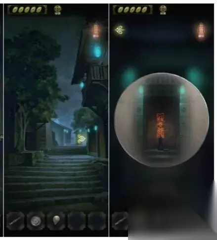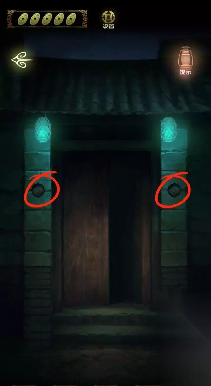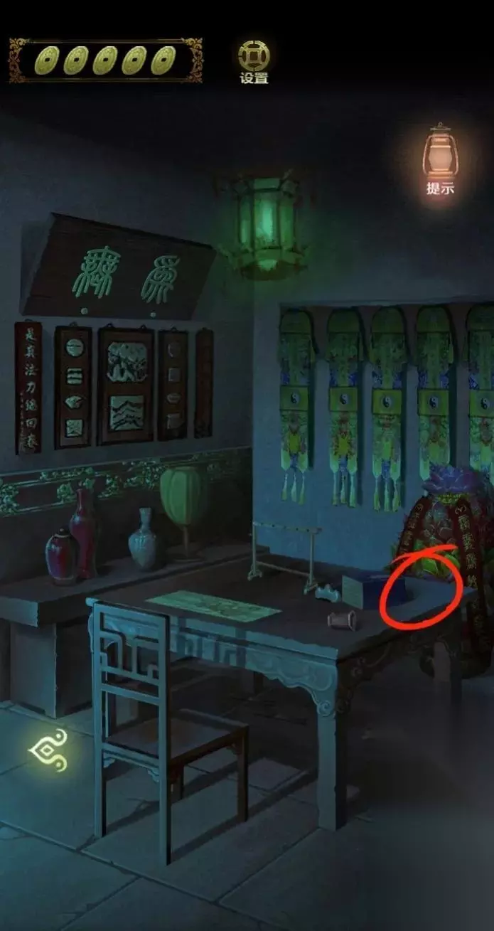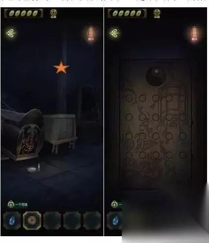 点击上面的灯笼,从灯笼下的八卦图案中得到线索,进入里屋,点击左侧书架上的机关,点击五个球,即可打开密室。