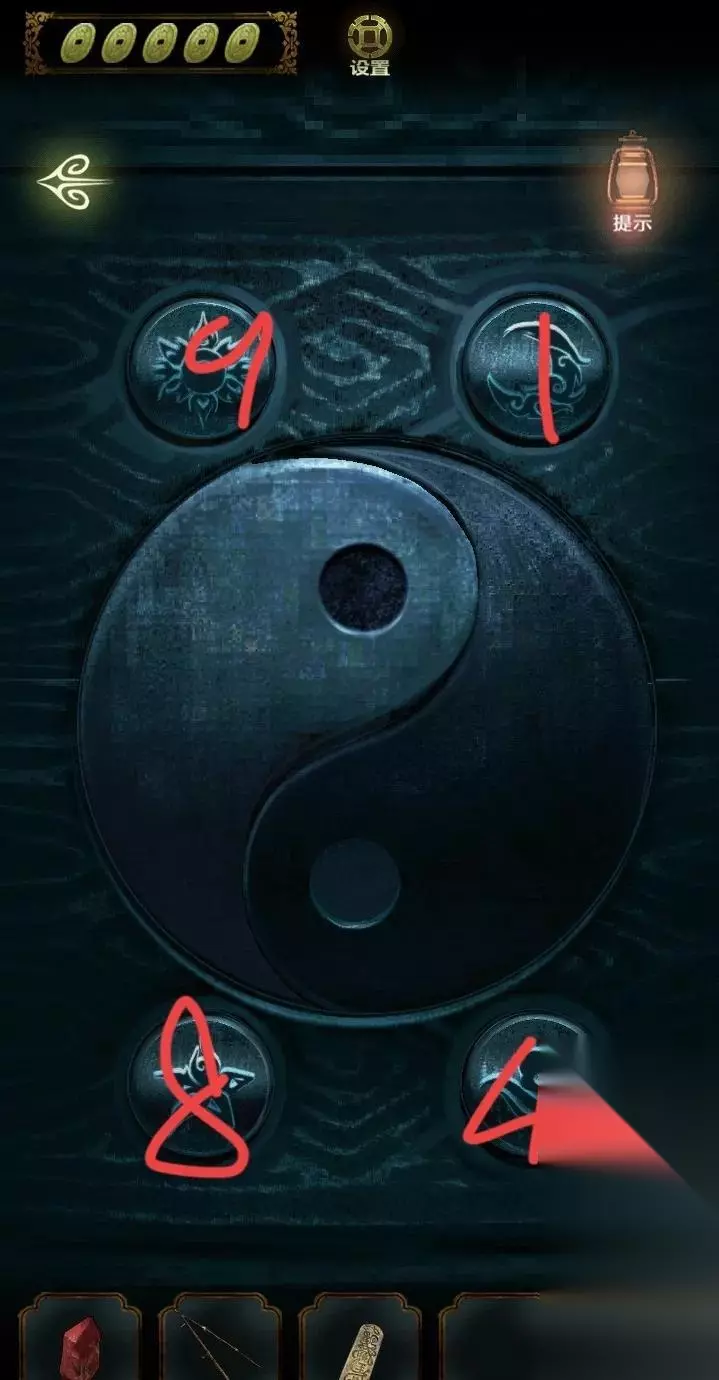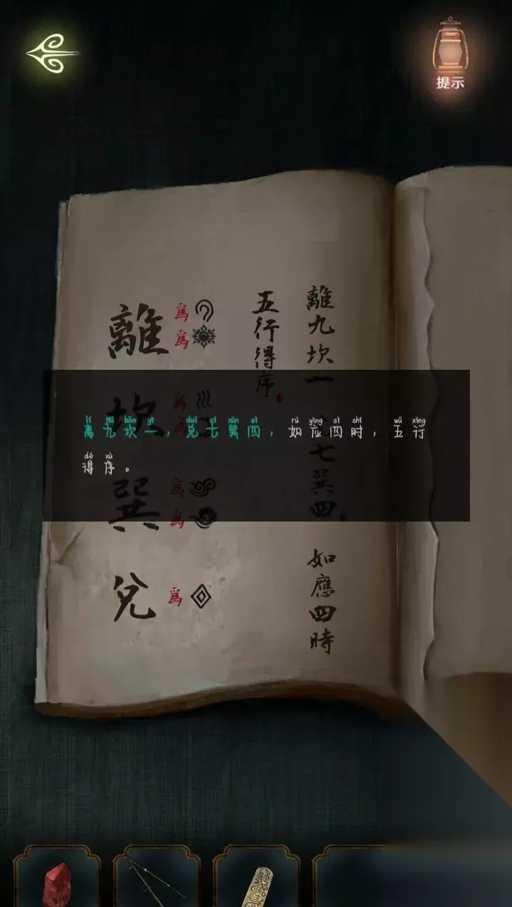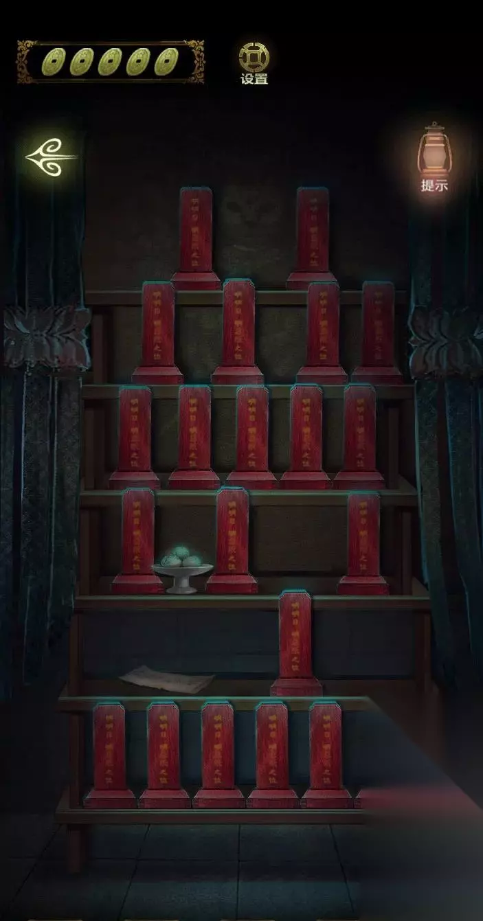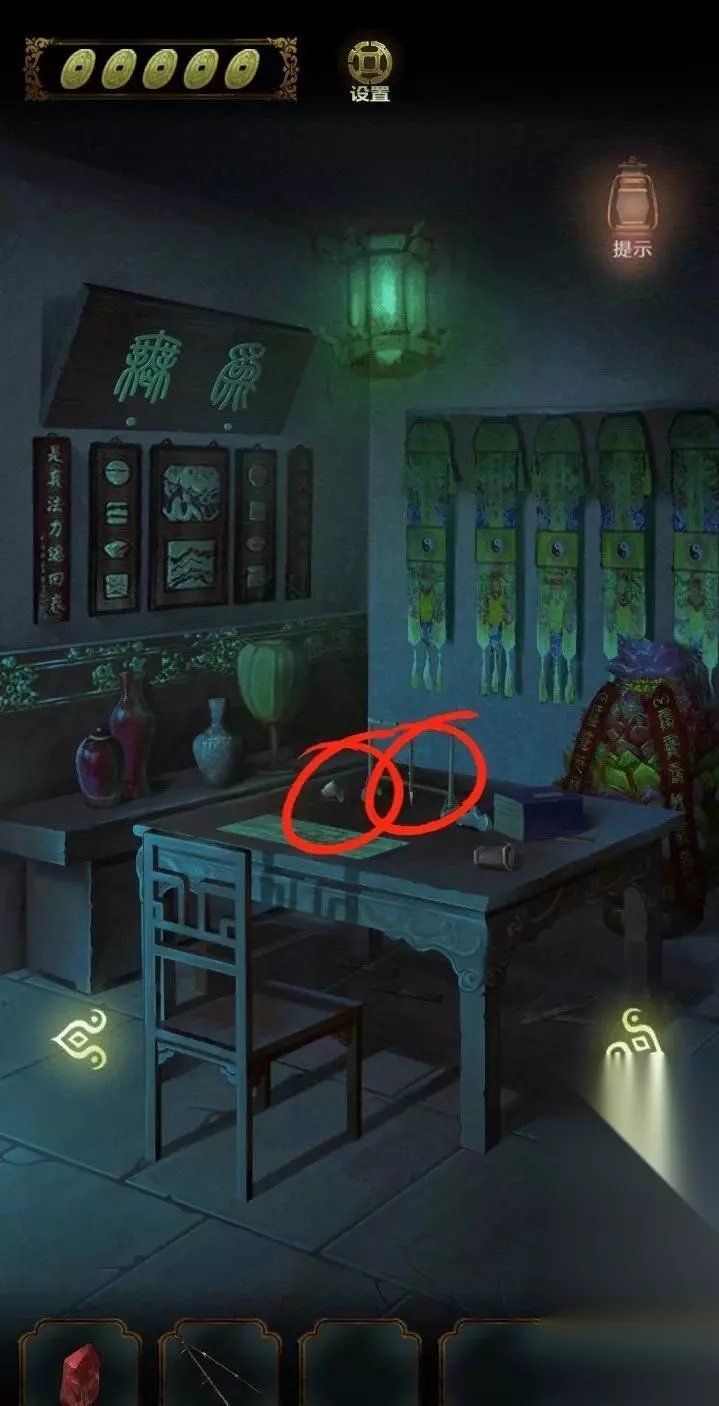 点击上面的灯笼,从灯笼下的八卦图案中得到线索,进入里屋,点击左侧书架上的机关,点击五个球,即可打开密室。