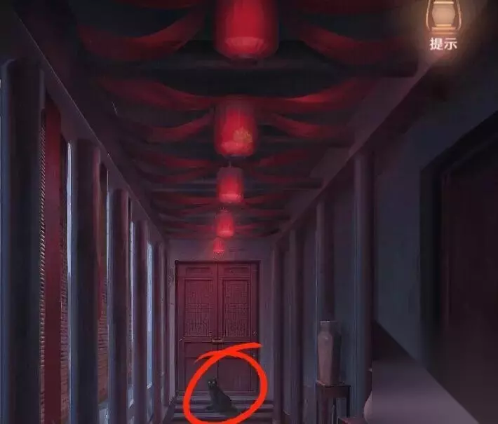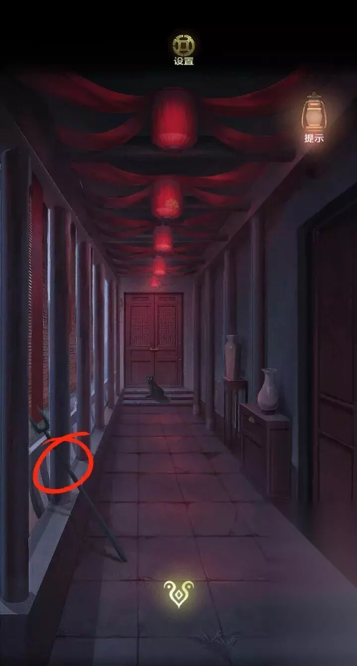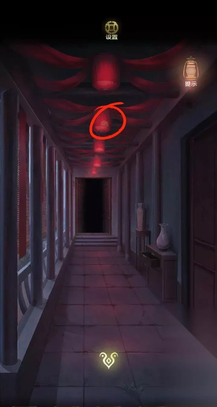 点击走廊里的灯笼,使用弹弓,连续击打三下,使灯笼内的莲花支柱落下。