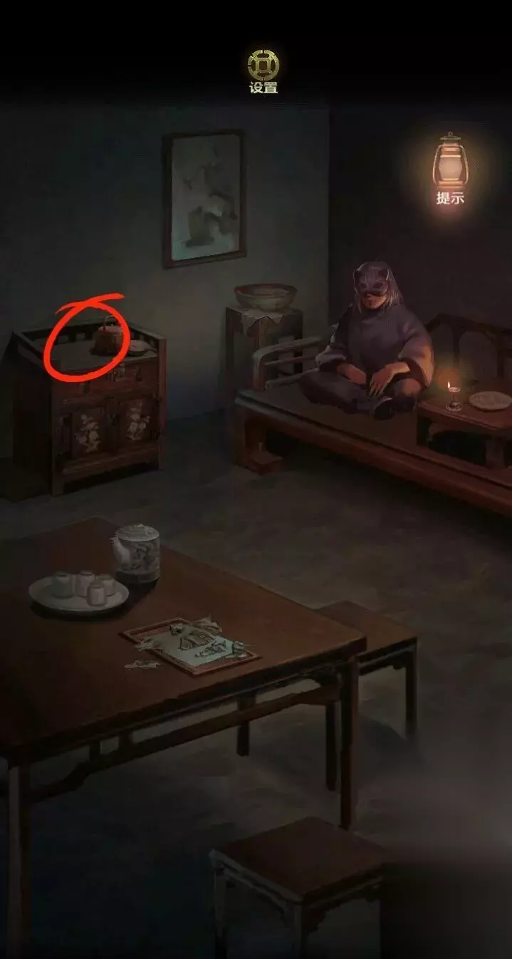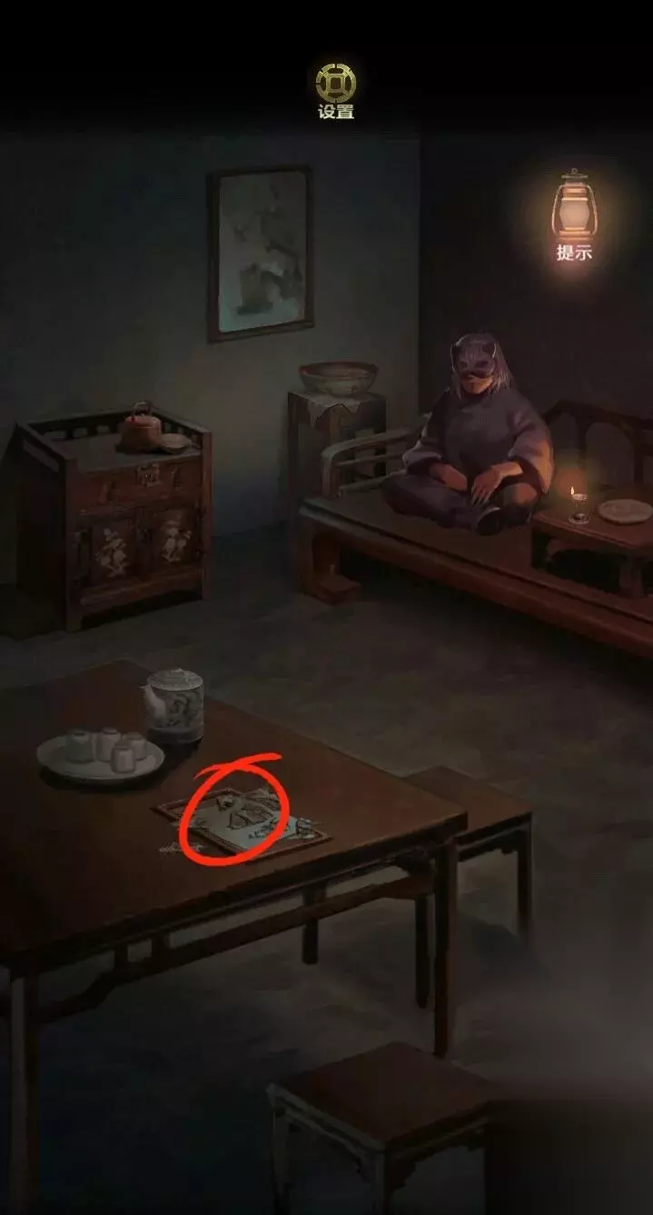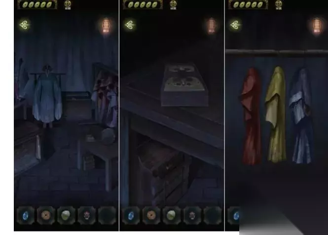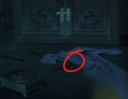 这时候探索场景,发现相入可以进去后台,桌子上有盒子,桌子下有带锁的盒子。大箱子可以藏人,旁边的衣服是蓝红黄三色,还有一个锁住的大箱子。桌子上的盒子开关圆圆的,之前获得的铜钱可以放在上面。