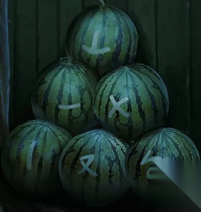 .点击东字巷右边的房门,在房门左下点击图案,根据图案中西瓜的摆放方式,对照西瓜堆上的图案,得到密码。