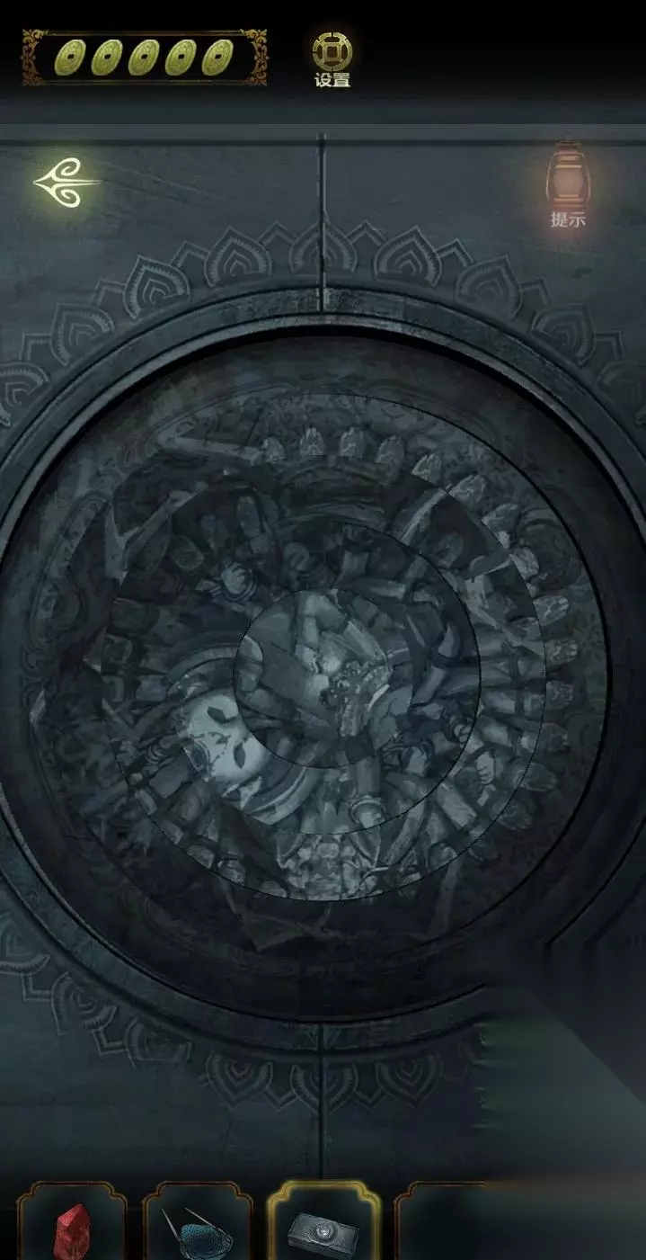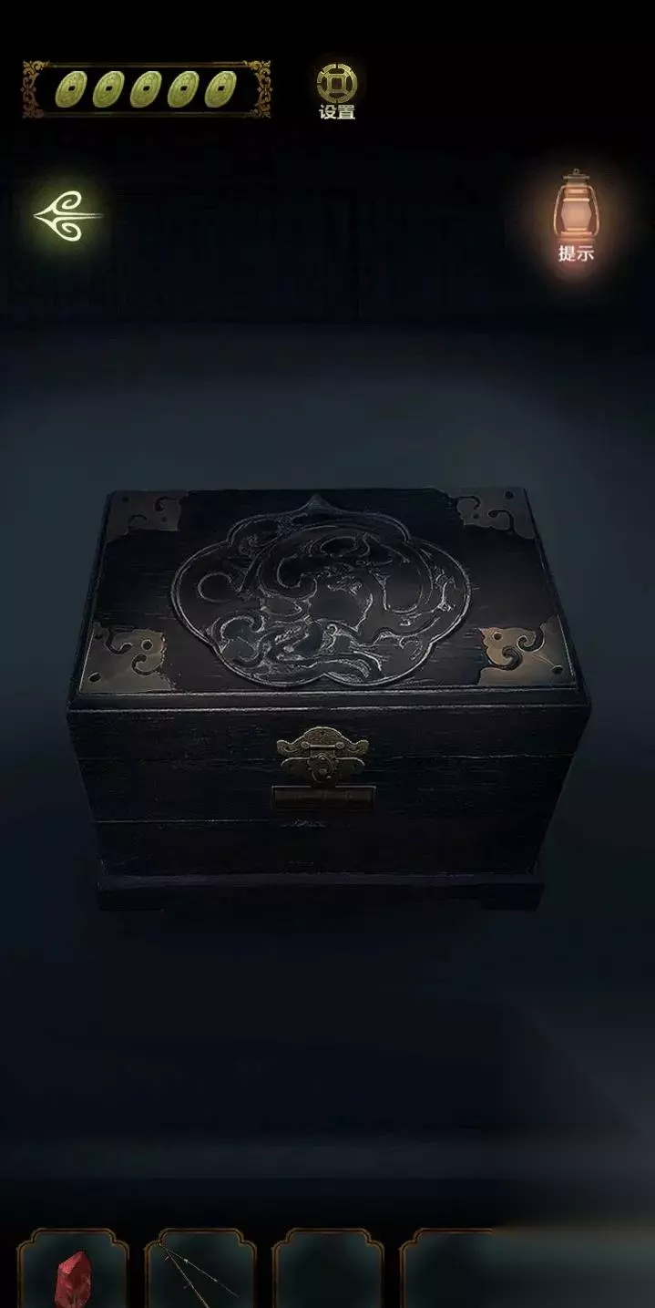 进入前院,点击钓鱼获得的木箱,转动木箱上的图案进行匹配,得到钥匙,打开门。