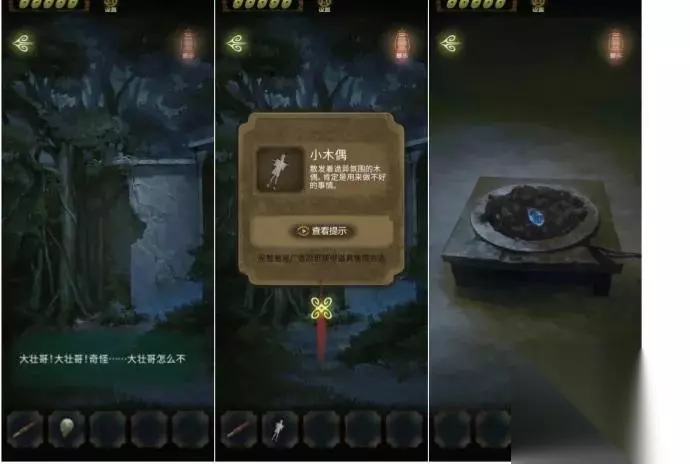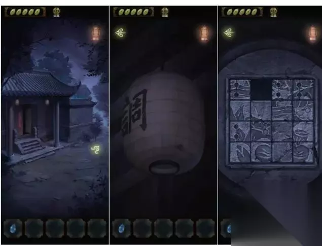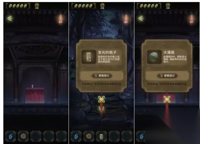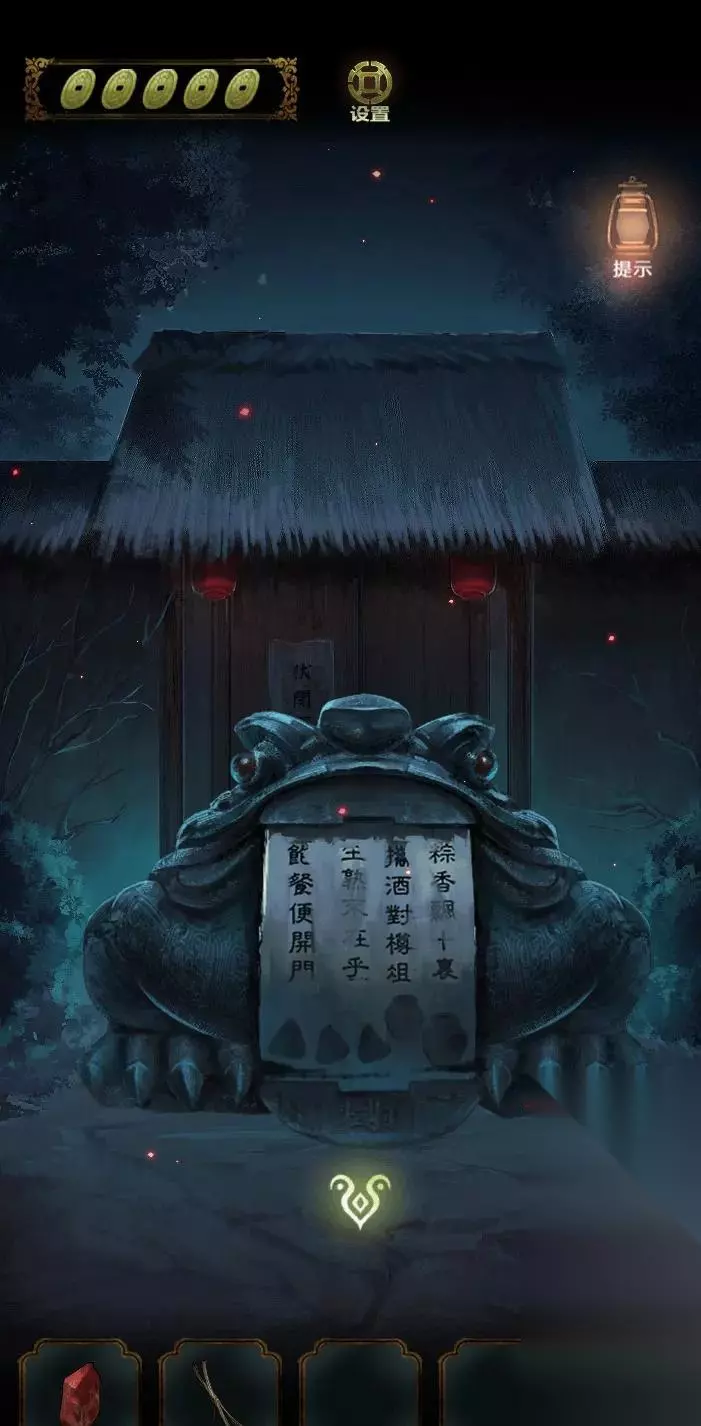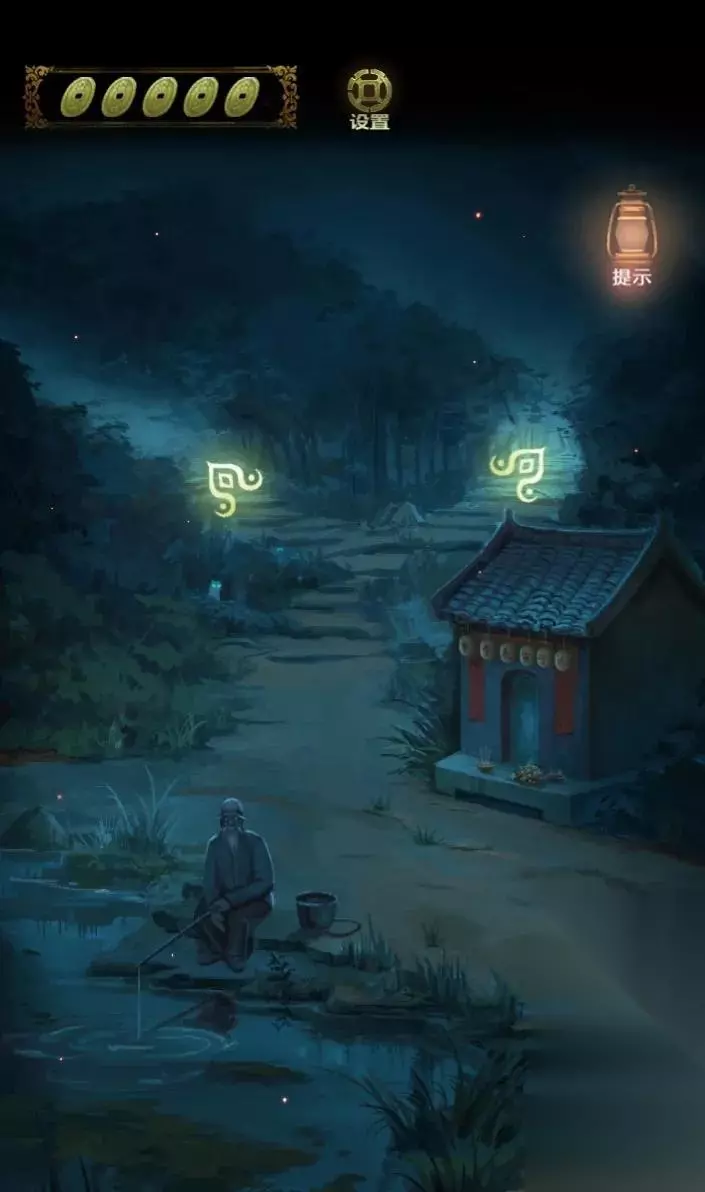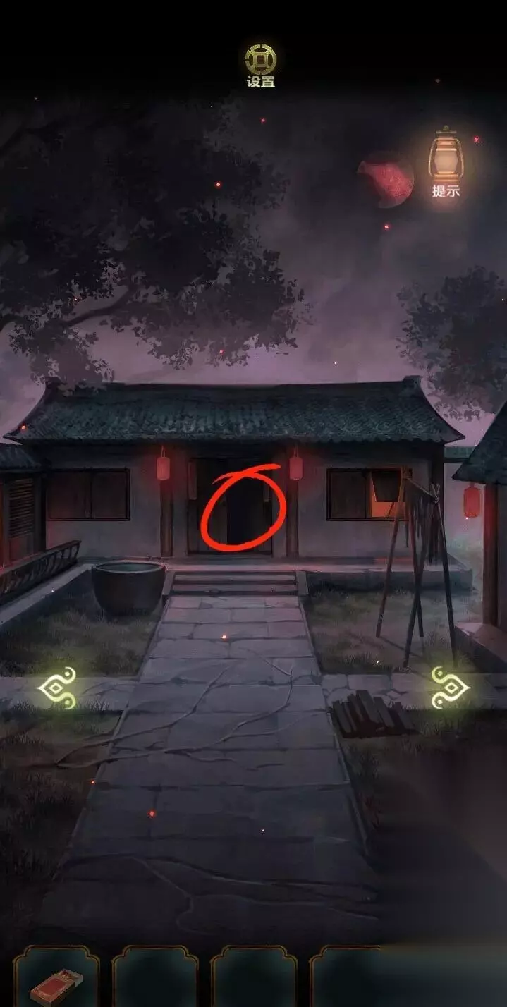 开局先探索场景,右边的山路有两条路,一条走不通,一条有萤火虫,返回祠堂门口,点击右边灯笼发现场景,点击右边石墩先解谜游戏。