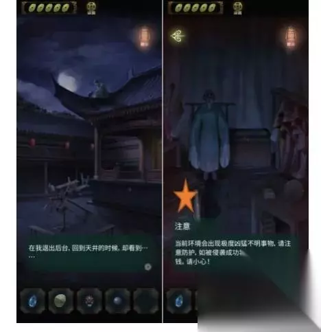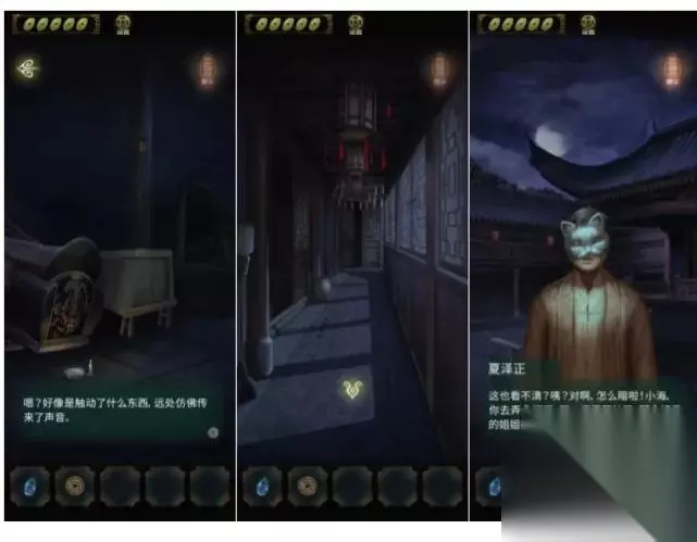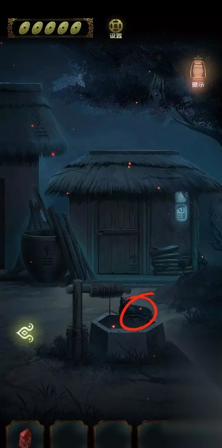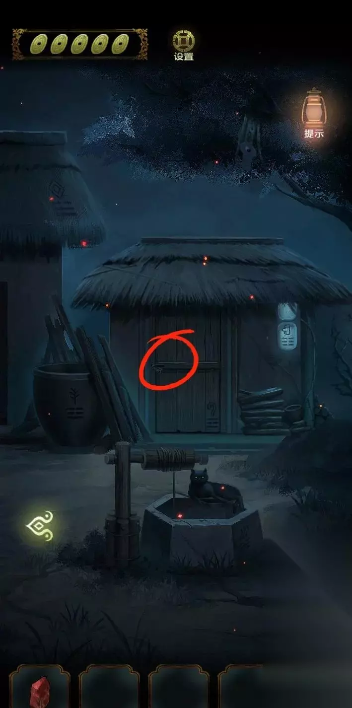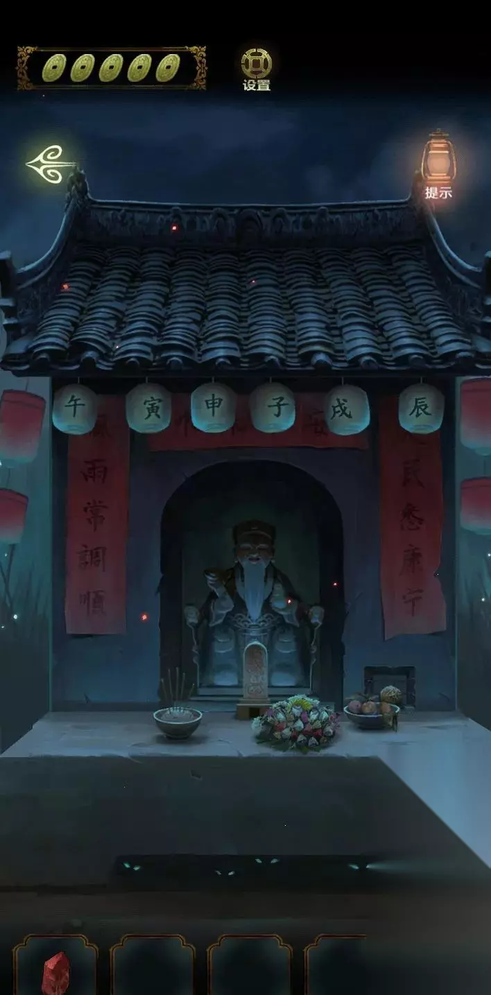 开局先探索场景,右边的山路有两条路,一条走不通,一条有萤火虫,返回祠堂门口,点击右边灯笼发现场景,点击右边石墩先解谜游戏。