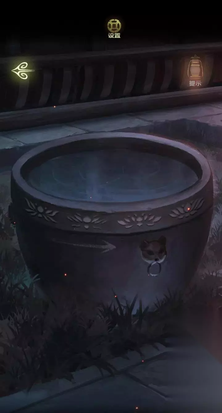 点击右边门进入,点击水缸,用花瓶装水。观察地上有黑白两色的圆形图案。