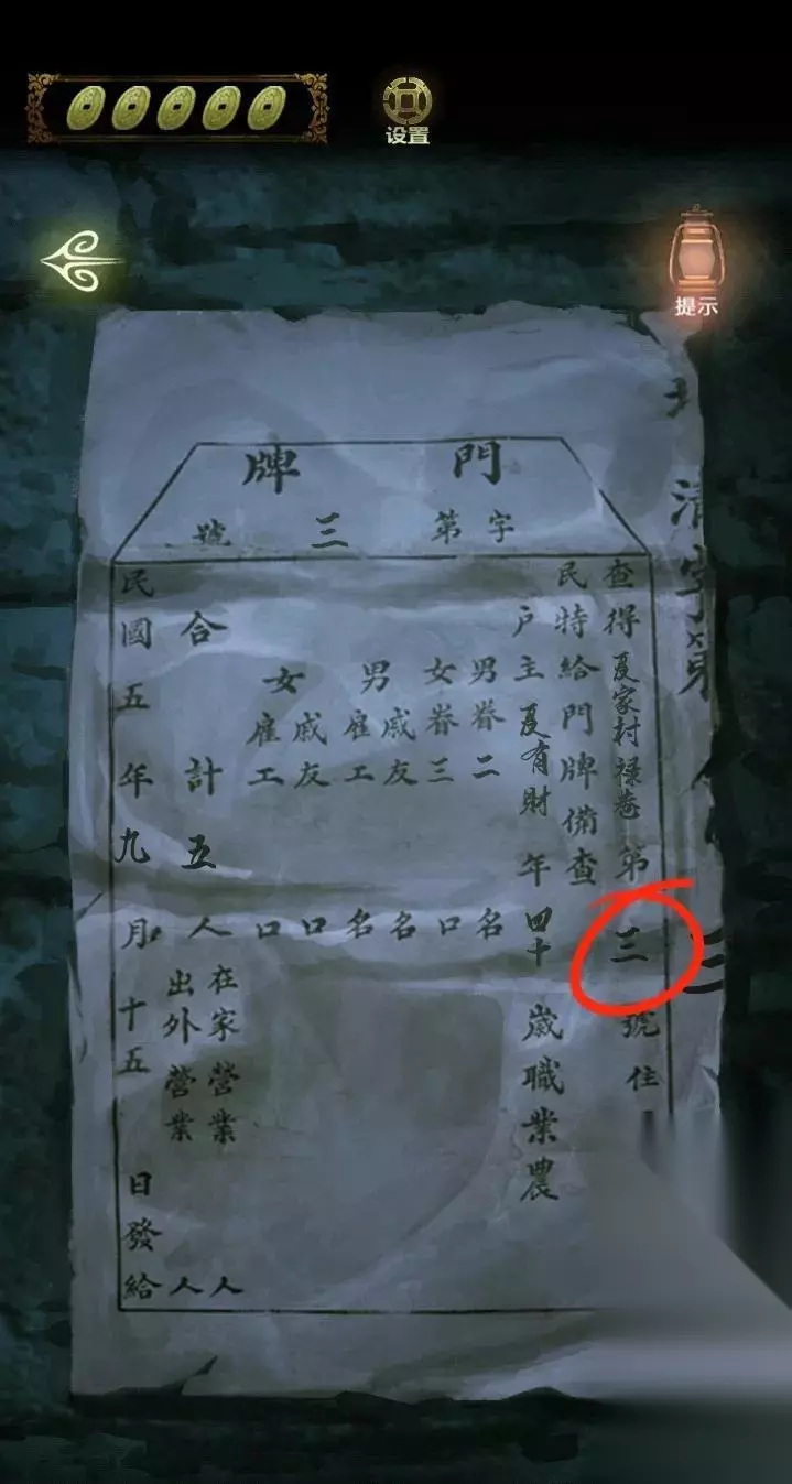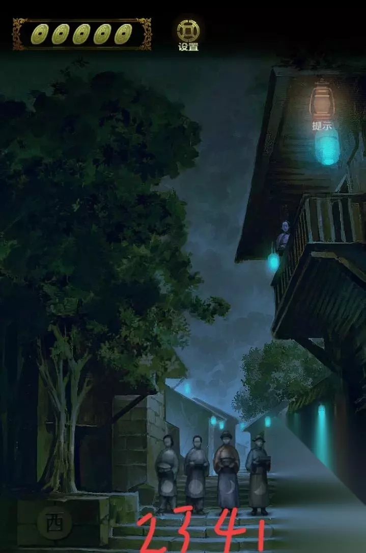依次前往禄字巷、西字巷、寿字巷、北字巷、善字巷,点击右侧房门,在房门右侧点击门牌,根据门画和门牌号,得到密码:贰伍柒捌叁。