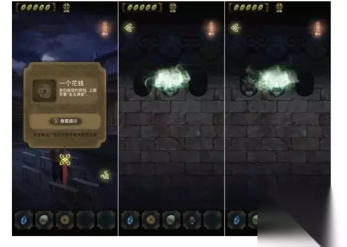 通过对话,得知傻正要明珠,把明珠给他,然后得到铜钱。发现墙上的面具游戏,将面具放进去,还差一个。