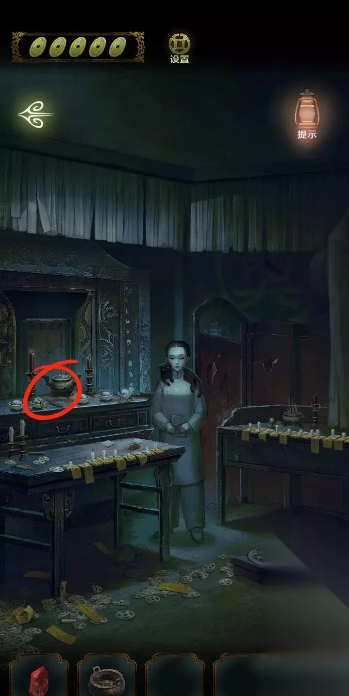 返回灵棚,点击左侧桌子上的罗盘,将两个罗盘构件和指针放进罗盘,得到完整罗盘。