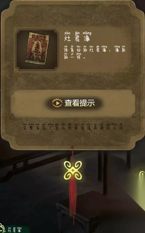 去奶奶的房间,使用粘贴,点击桌子上的肖像来制作拼图。完成拼图并获得灶神雕像。