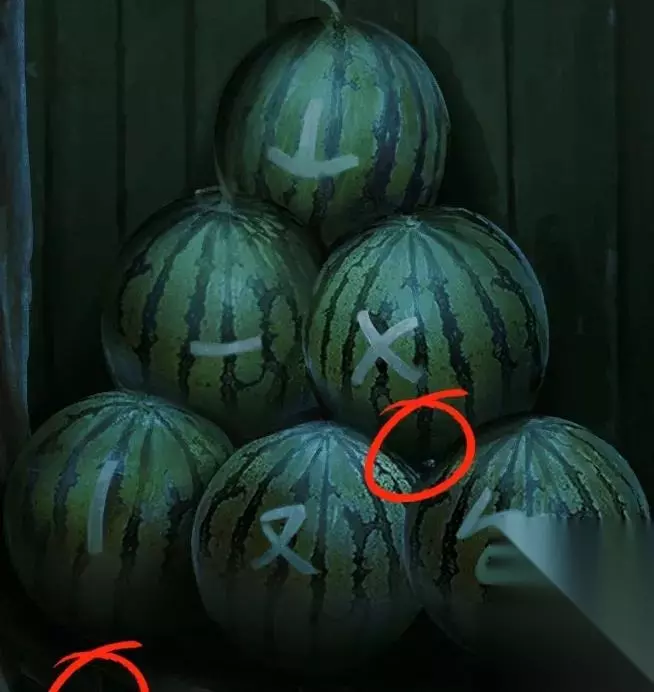 注:得到铜镜后来到福字巷,点击向左箭头进入南字巷,在这里使用铜镜可以看到黑猫,根据黑猫的位置点击箭头,依次可到禄字巷、东字巷、北字巷、寿字巷、西字巷、善字巷。 来到东字巷,点击西瓜堆。 在西瓜堆左下角找到纸条线索,并在第二层和第三层西瓜中间右边缝隙中找到指针。