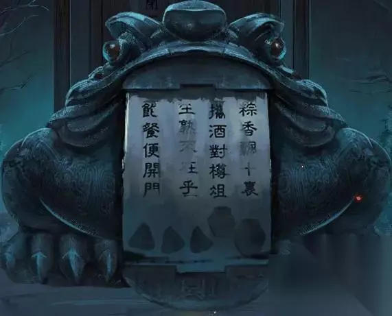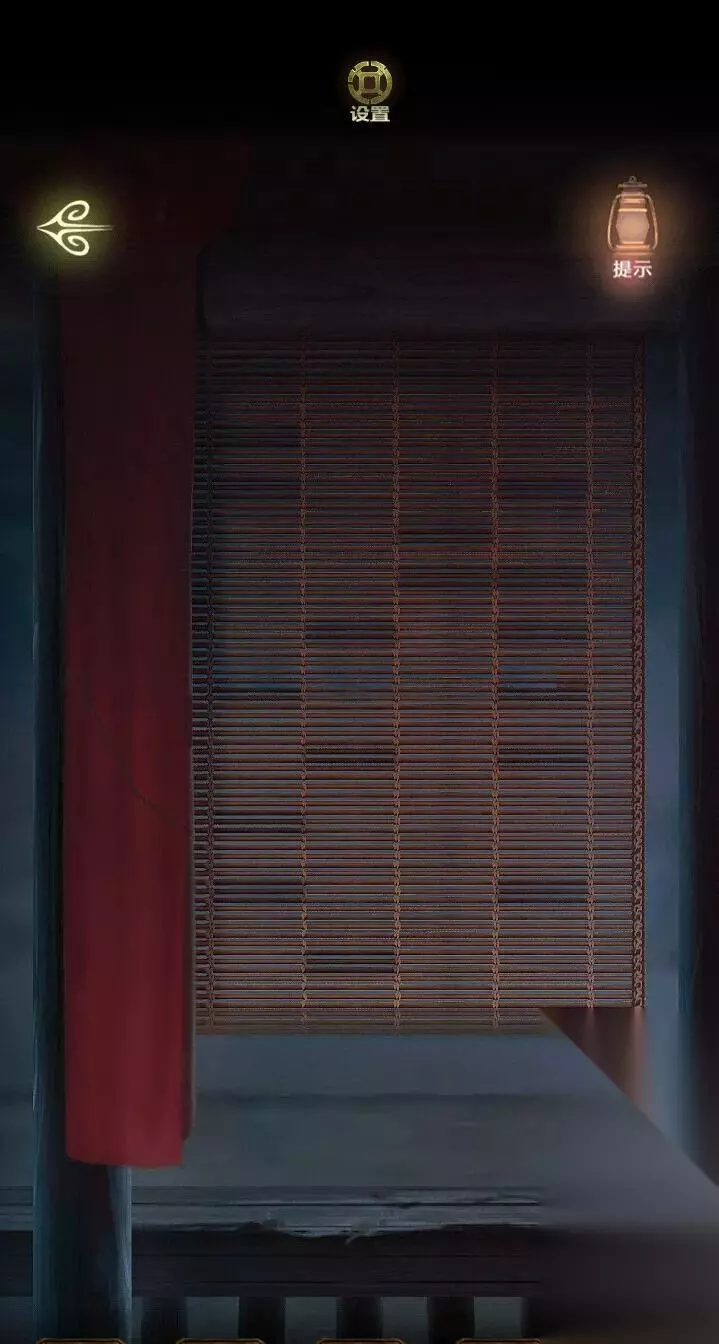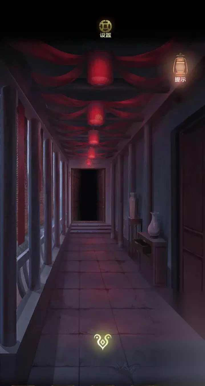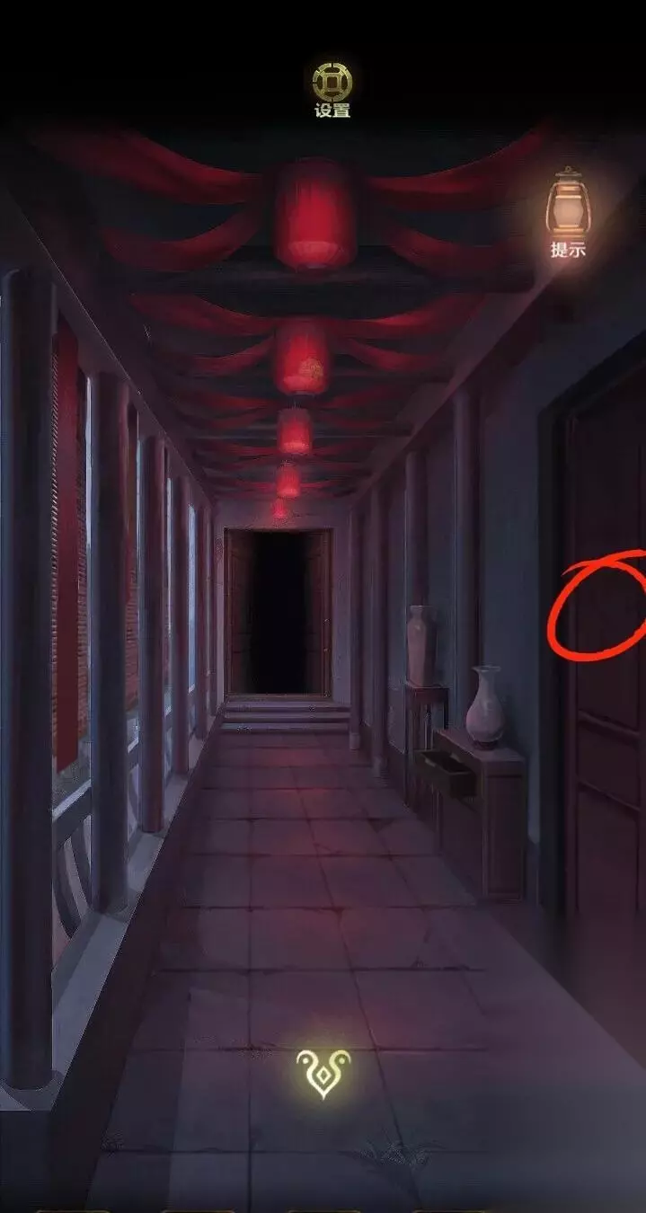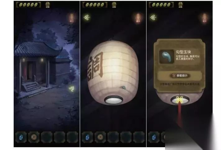来到门口石墩玩游戏,根据走廊的线索完成拼图。打开后发现门口的灯笼亮了,点开右侧的灯笼,获得一个勾形玉块,拿着玉块去柱子上解谜。