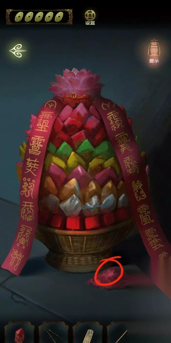 点击花篮,用茶杯收集朱砂粉。