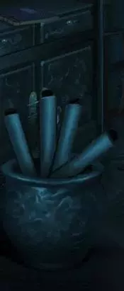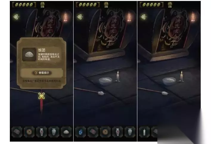 然后需要拿下房顶上的照片,需要一个长的东西,棺材前有一根棍子。水碗用在米饭上获得饭团,然后把饭团用在棍子上。将蜡烛滴在饭团上,获得一个有粘性的棍子,用棍子去拿照片。