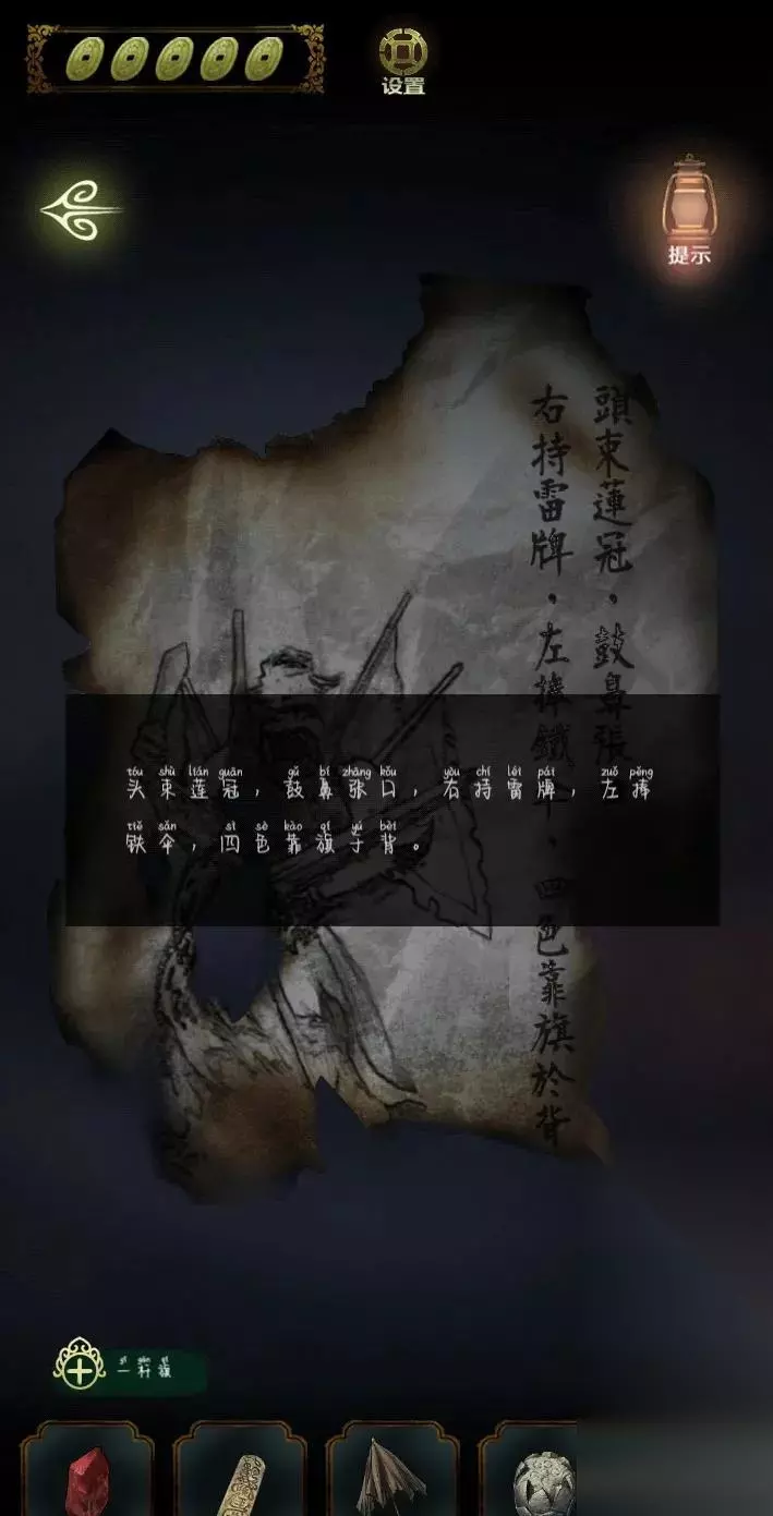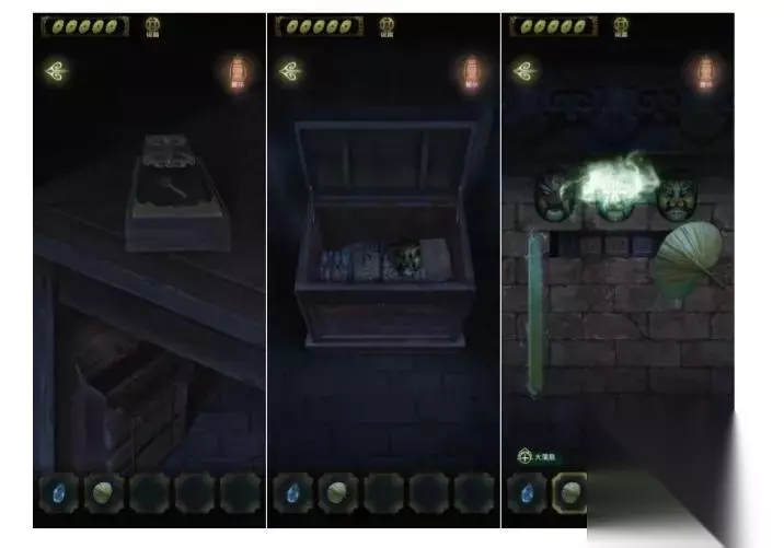 去相入把铜钱放在桌子上的小盒子上,获得钥匙,然后打开地上带锁的箱子,获得黄色面具和箱子盖子上的密码,来到戏台玩面具游戏,拿着蒲扇扇去雾气(快速点击)