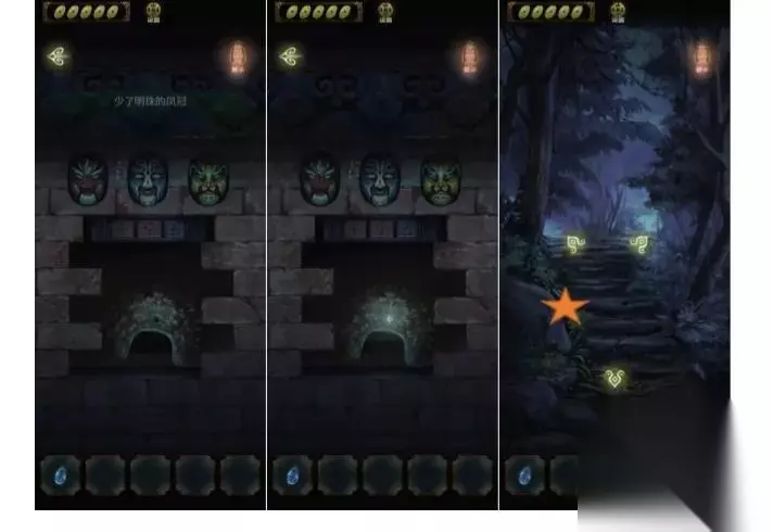 完成后可以根据面具颜色和图形去解锁面具。得到线索少了明珠的凤冠,去找傻正拿到明珠放上去,然后去山路,一位美少女帮我们指路,在山路上获得黄色石头,完成对话这章结束