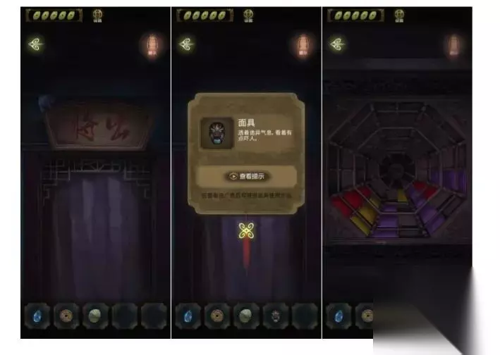 退出相入,点击将出,获得一个面具,牌匾上画着符号。回到戏台,房顶可以进入,获得颜色(红黄紫)相关的密码,去相入完成衣服小游戏,根据房顶的颜色顺序和数量依次点击。