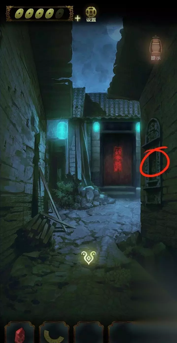 前往福字巷里面的巷子,点击有符的门,再点击门右下角的石墩。 输入密码:贰伍柒捌叁,打开机关,得到罗盘构件。